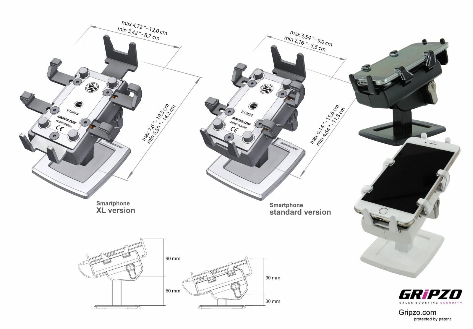 Through adjustable grips on the security brackets devices of any dimensions will fit. Special XL grip sets for tablets larger than 10.2” and phones larger than 6”